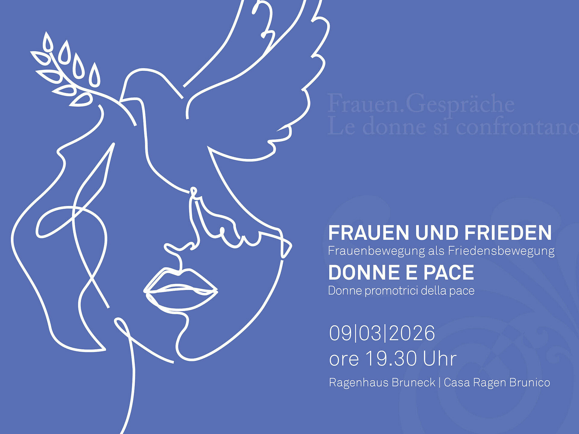 Anlässlich des Internationalen Tags der Frau laden die Organisatorinnen der Stadtgemeinde, Stadtbibliothek, des Club Soroptimist Pustertal, des NOBIS und der Raiffeisenkasse Bruneck alle Interessierten herzlich zu einem Abend im Zeichen des Friedens nach „Frauenart“ ein.