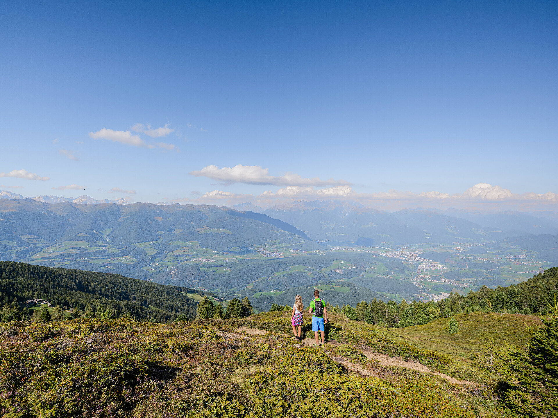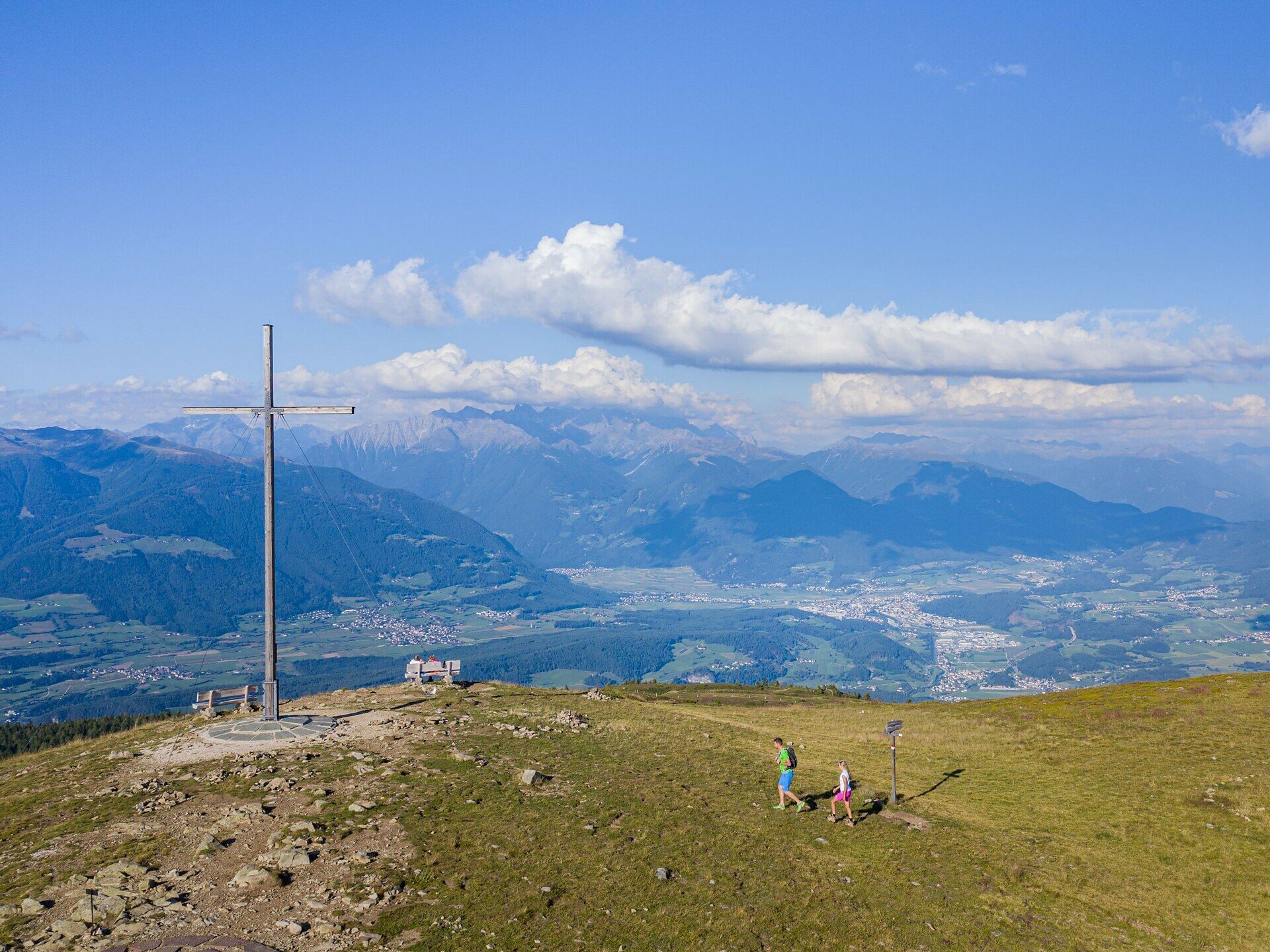 The hike to Astjoch starts at the Kreuzner parking lot above the hamlet of Ellen. Below the parking, the well-marked forest trail no. 67 branches off in direction Astjoch/Burgstall. It leads on a pleasant ascent to the charming alpine hut "Walderalm", which after about an hour is the perfect place to take a break and enjoy the view of the Bruneck valley basin. Behind the hut, the trail winds its way to the near forest border and then climbs gently through panoramic meadows and pastures to Astjoch. At the high summit cross, you can enjoy a breathtaking panoramic view of the Pustertal valley, the Zillertal Alps, the Eisacktal valley and the Dolomites. A panorama point displays the names of some of the surrounding mountain peaks. Return along the same route.