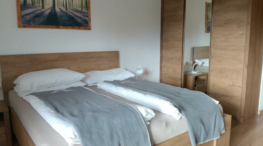 Das geräumige Dreibettzimmer (22 m²) bietet viel Platz für kleine Familien oder Freunde. Ein großes Doppelbett und ein Einzelbett sorgen für erholsamen Schlaf, während Holzböden und gemütliche Einrichtung eine warme Atmosphäre schaffen. Vom Balkon bzw. der Terrasse genießt du den Blick auf Garten und Berge. Zur Ausstattung gehören Flachbild-Sat-TV, kostenfreies WLAN, Schreibtisch und Wasserkocher. Das private Badezimmer verfügt über Dusche oder Badewanne, Haartrockner, Handtücher und kostenlose Pflegeprodukte – perfekt für einen entspannten Urlaubstag.