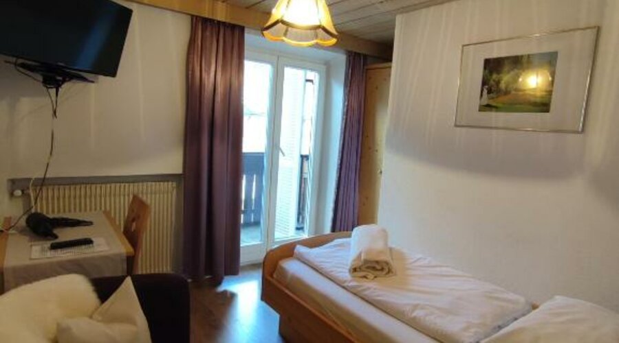 Das gemütliche Einzelzimmer (11 m²) ist ideal für Alleinreisende, die Ruhe und Komfort suchen. Warme Holzböden und -möbel sorgen für eine angenehme Atmosphäre, während Balkon oder Terrasse einen schönen Blick auf die umliegende Bergwelt bieten. Zur Ausstattung gehören Sat-TV, kostenfreies WLAN, Schreibtisch, Wasserkocher und ein komfortables Bett. Das private Badezimmer verfügt über Dusche oder Badewanne, Haartrockner, Handtücher und kostenlose Pflegeprodukte – alles für einen entspannten Aufenthalt.