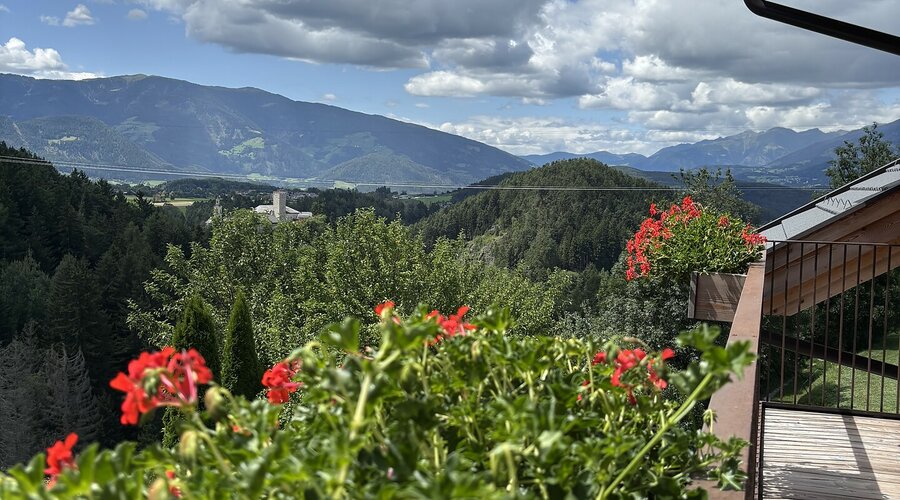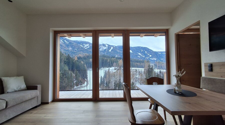 The apartment Burgblick, measuring 52 sqm, is located on the second floor and offers plenty of space for a relaxing holiday in a comfortable atmosphere. From the west-facing balcony and through the large panoramic window, you can enjoy a stunning view of the surrounding mountains.