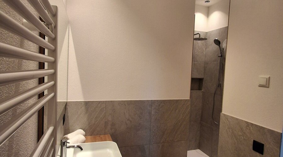 The apartment features two bedrooms: one with a comfortable double bed and a second bedroom with a single bed (1.40 m). In addition, the spacious living area includes a pull-out sofa bed for two people. The open-plan living space is combined with a fully equipped kitchen, offering everything you need for a pleasant stay: dishwasher, large fridge with freezer, electric hob, coffee machine, toaster, electric kettle, as well as cooking utensils, pots, dishes, glasses, and tea towels.